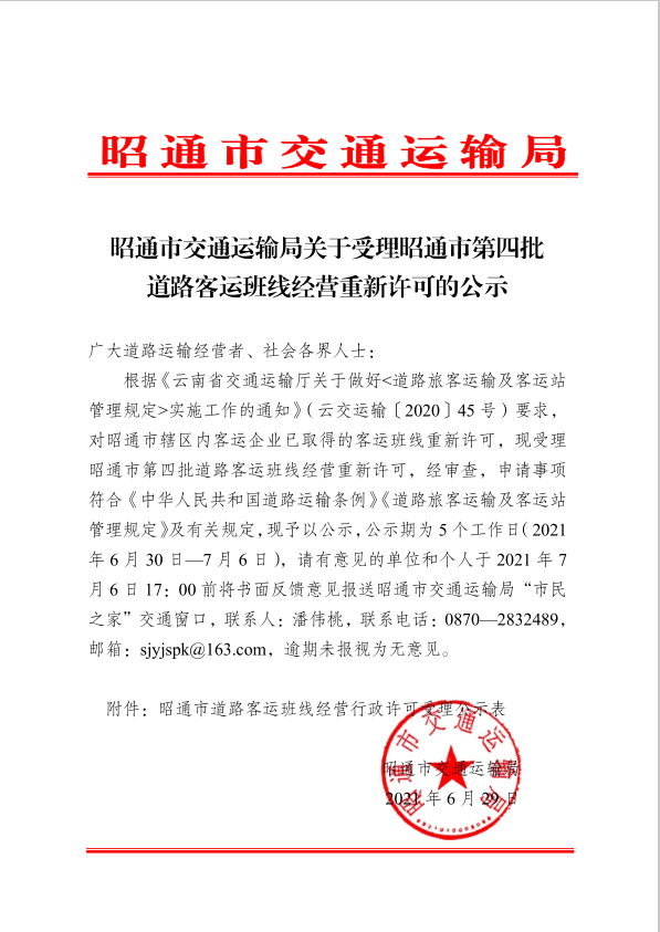 昭通市交通運輸局關(guān)于受理昭通市第四批 道路客運班線經(jīng)營重新許