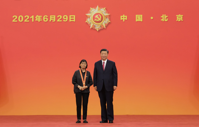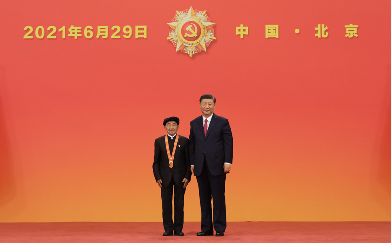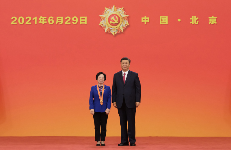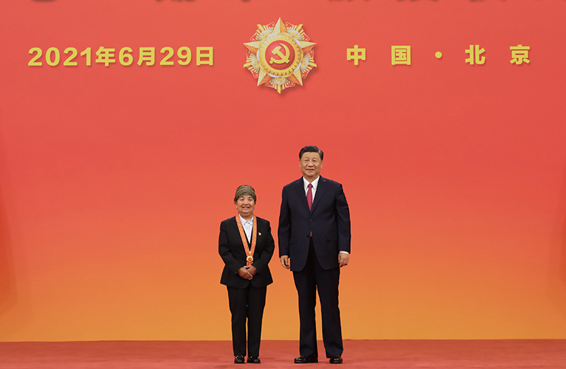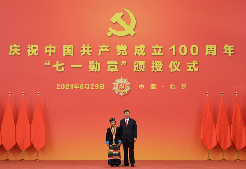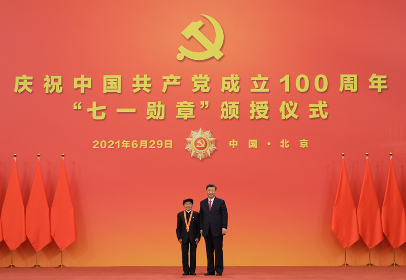 6月29日,慶祝中國共產(chǎn)黨成立100周年“七一勛章”頒授儀式在北京人民大會(huì)堂金色大廳隆重舉行。中共中央總書記、國家主席、中央軍委主席習(xí)近平向“七一勛章”獲得者馬毛姐頒授勛章。新華社記者 李學(xué)仁 攝