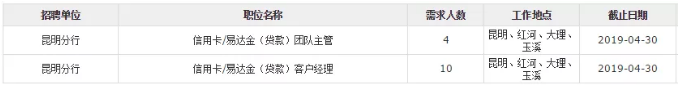 (二)信用卡/易達(dá)金(貸款)客戶經(jīng)理(工作地點可選擇:昆明、紅河、大理、玉溪)