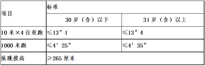 2.體能測(cè)試為達(dá)標(biāo)制,并采取一票否決制。達(dá)到規(guī)定項(xiàng)目標(biāo)準(zhǔn)即為合格,否則為不合格,進(jìn)入筆試環(huán)節(jié)。