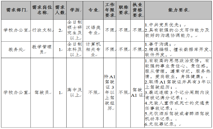 為適應學校發(fā)展的需要,需面向社會誠聘4名工作人員,現(xiàn)將有關事項公告如下: