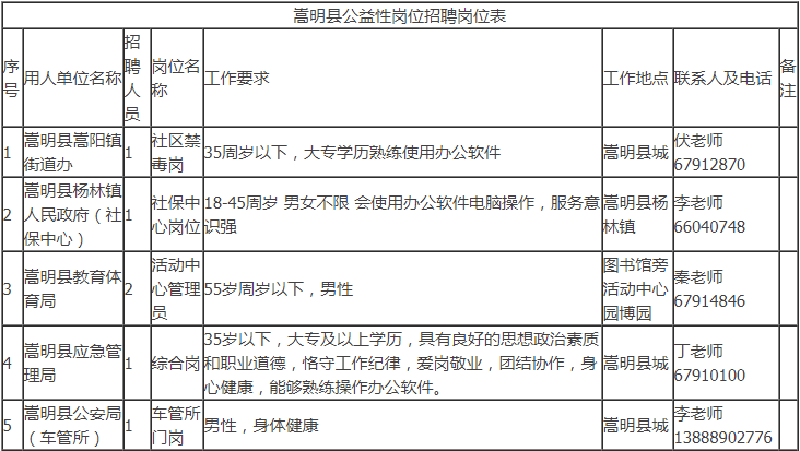 招聘具體事宜請咨詢用人單位,符合公益性崗位上崗條件的個(gè)人也可以到嵩明縣勞動就業(yè)服務(wù)局綜合科申請公益性崗位求職登記,詳詢陳老師:0871-67917444。
