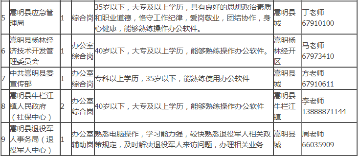 招聘具體事宜請咨詢用人單位。符合公益性崗位上崗條件的個人也可以到嵩明縣勞動就業(yè)服務(wù)局綜合科申請公益性崗位求職登記,詳詢陳老師:0871-67917444。