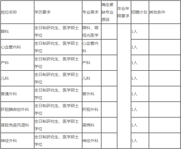 (一)市人民醫(yī)院。引進崗位8個,其中眼科1個、心血管內科1個、產科1個、兒科1個、普通外科1個、肝膽胰微創(chuàng)外科1個、腎臟免疫風濕科1個、神經外科1個。